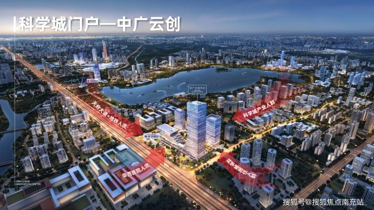 中广云创项目,坐落城市中轴天府大路旁+地铁1号线科学城站上盖物业,是科学城的交通门户及形象地标。科学城工业人群、寓居人群、华西就医人群、兴隆湖旅行百万人潮会聚于此。